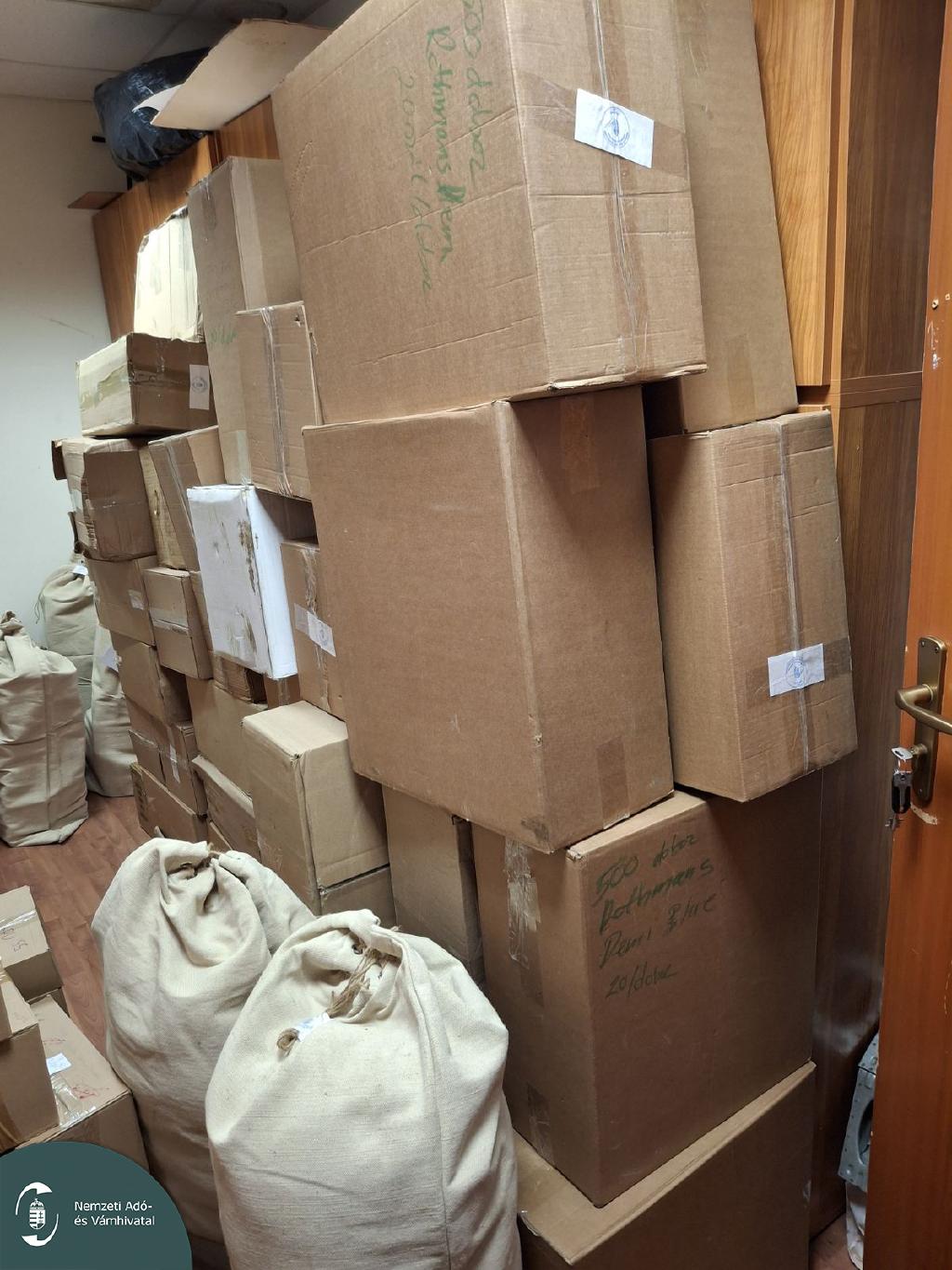 A rejtekhelyről 13 881 doboz, különféle márkájú, magyar zárjegy nélküli cigaretta, 33,73 kilogramm vágott fogyasztási dohány, 59 darab ízesített elektronikus cigaretta, és 10 liter ismeretlen eredetű alkoholtermék került elő.